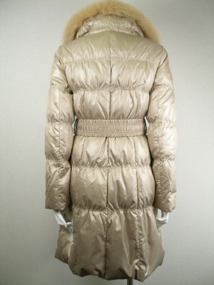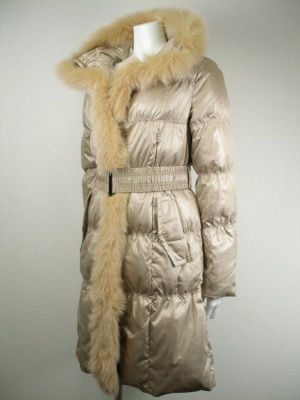 シャンパンゴールドの光沢ある色が特徴のロングタイプのダウンコート ファーは取り外し可能 ベルトはシャーリングゴム