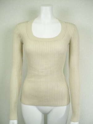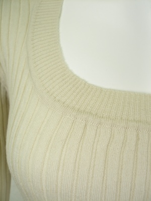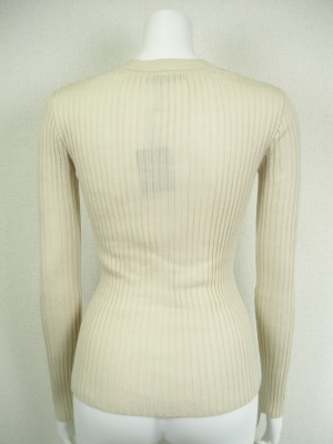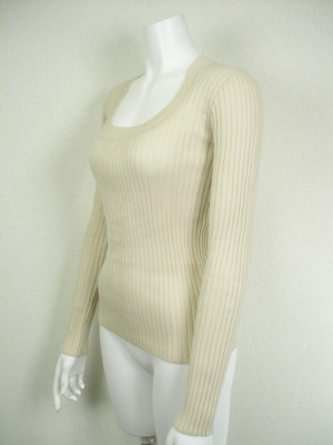 かがんでも胸元が開かず安心なラウンドネックリブニット。手洗いしても縮みにくく、毛玉ができにくいトリートメント加工を施してあります。