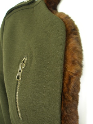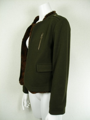 ノーカラーで前を閉じずに着るジャケット。レッキスのファーは取り外せます。