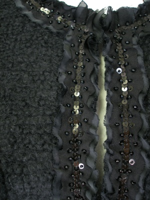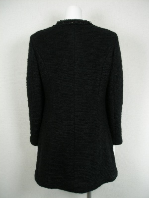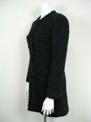 シフォンのトリミングが上品な、ツイードのロングジャケット。フロントはカギホック留め、裏地付き。