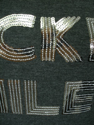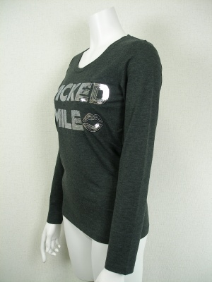 スパンコールのロゴがポイントのTシャツ。ストレッチの効いた着やすい素材です。