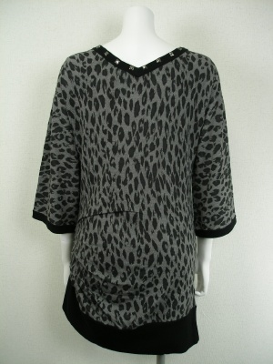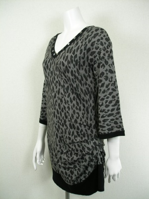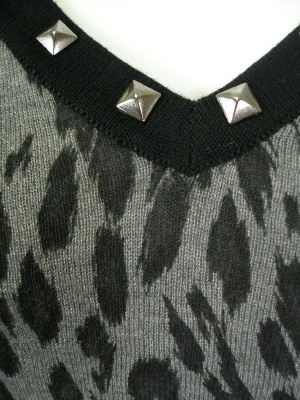 ネックラインのスタッズ、広がったお袖、シックなレオパード柄など、トレンド満載なニットチュニック。シンプルに着こなしたい。