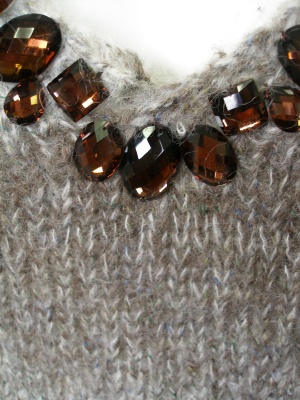 モヘアの入ったふんわり軽いニット。グラデーションの優しい色合いです。胸元に縫いつけたクリスタルパーツがアクセント。