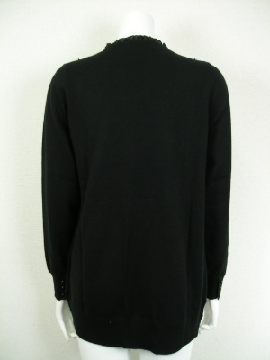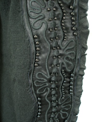 サテン部分にはビーズと刺繍が施されています。ニット素材で裾と袖口はリブ、袖口にはボタンが3つ。フロントはカギホック一つ。
