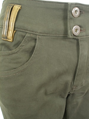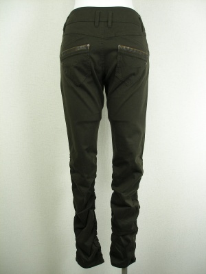 股上深めのとても穿きやすいストレッチギャザーパンツ。ベルトループやポケットに合皮を使用。