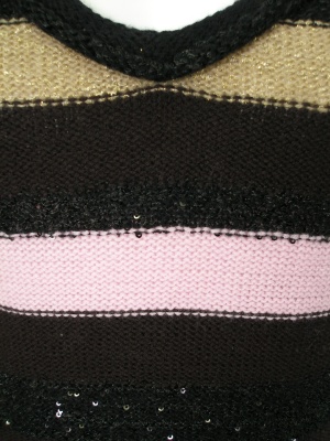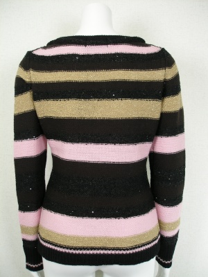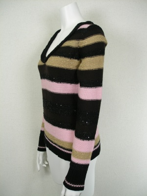 小さなスパンコールやラメ糸で華やかなボーダーニット。深いVネックなのでタンクトップやキャミソールを重ねて、冬は薄手タートルをインナーにしても。
