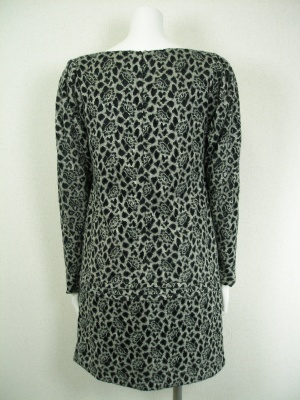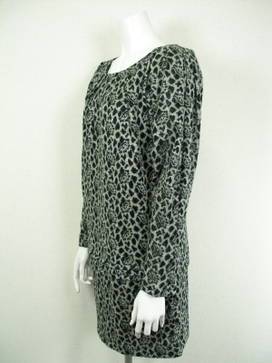 アニマル柄にも見えますがよく見ると花柄です。ローウエストで切り替え。身ごろのみ裏地付きでお袖は透ける部分があります。
