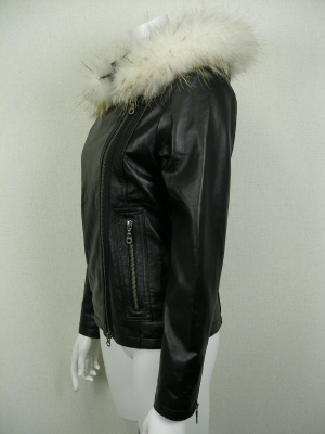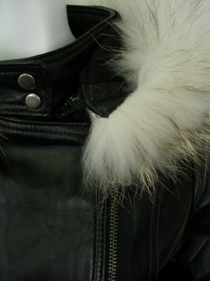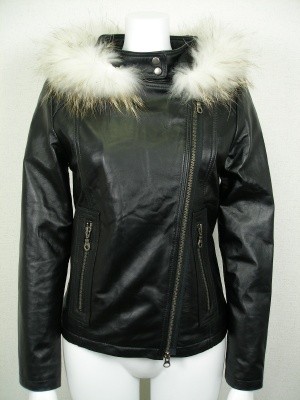 ベルトの付いていないスッキリしたデザインのライダースジャケット。ラクーンファーの付いたフードはジッパーで取り外せます。(ファーは縫いつけ)