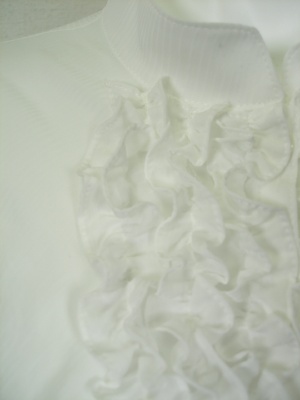 薄く繊細な素材のフリルブラウス。幅の狭い小さなフリルが6列並んでいます。やや透けますので、一枚で着るならインナーが必要です。