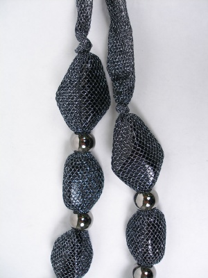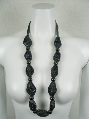 ランダムな形のパーツをラメ素材でくるんだロングネックレス。シックな色合いですが存在感があります。