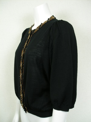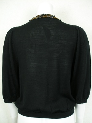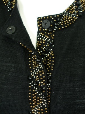 前立てと首周りに縫い付けたビーズが上品なショート丈カーディガン。アームホールをゆったり取りふんわりさせたお袖が可愛い。