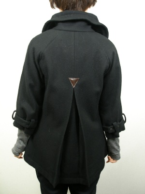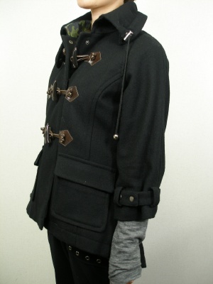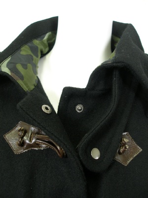ダッフルコートをアレンジしたデザイン。後ろをラウンドさせて長めに、七部袖からはインナーの長袖を見せたりロンググローブをつけたりしてレイヤードを楽しんで。裏地は迷彩柄です。