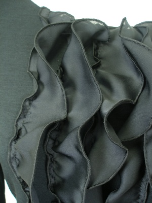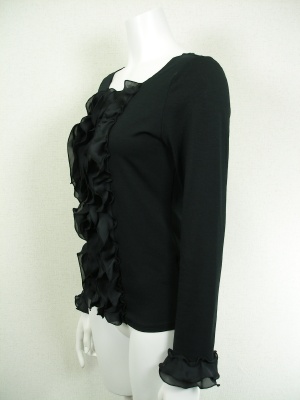ストレッチの効いた着やすい素材で、胸元と袖口のフリルはポリエステル。ジャケットを羽織るとブラウスを着ているように見えます。