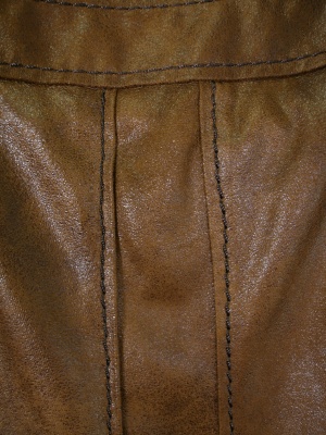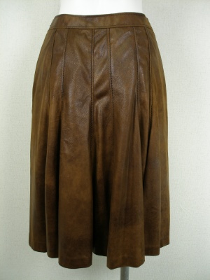 柔らかいフェイクレザーのような質感。腰周りはスッキリ、裾に向かって広がるデザイン。裏地付き。