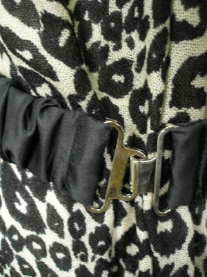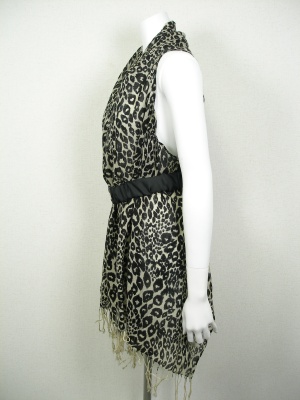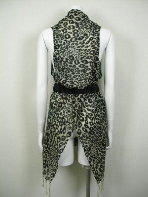 長方形のストールに開いた二つの穴に袖を通すとベストに。付属のゴムベルトでウエストマークして。