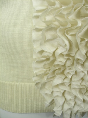 ボリューム控えめなフリルをたっぷり付けたニット。ふんわりしたお袖もカワイイ。フリルはポリエステル。