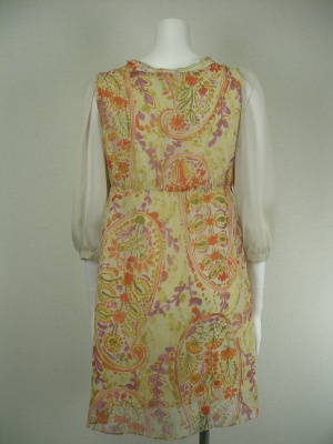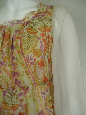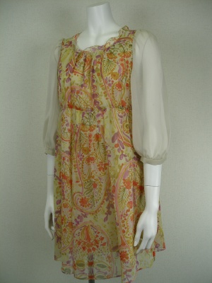 柔らかなシフォン地のチュニックワンピ 袖は透け感のある無地を用い、身頃の花柄プリントは透けを防ぐ裏付き、ハイウエストにゴムシャーリングで脱ぎ着がラクになってます