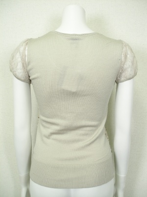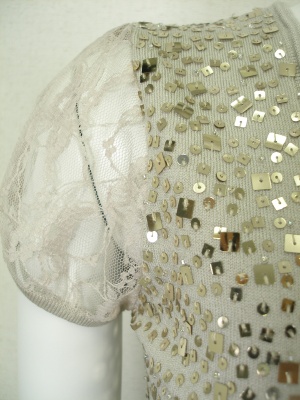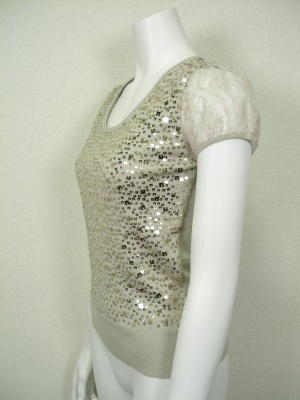 生地と同系色のスパンコールを散りばめてあり、お袖はレースを使ったフェミニンなニット。