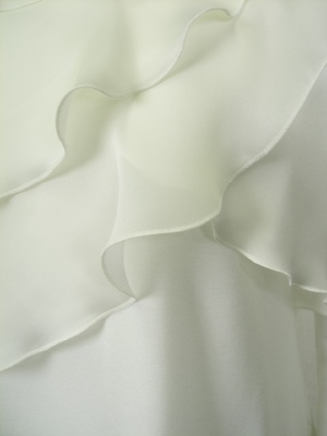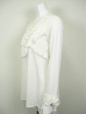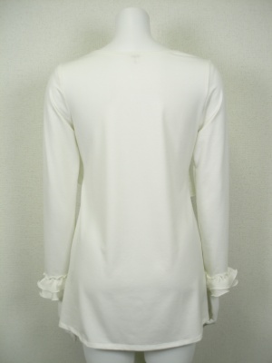 身頃とお袖はストレッチの効いたカットソーで、胸元と袖口のフリルはポリエステル。裾がやや広がったチュニックタイプ。