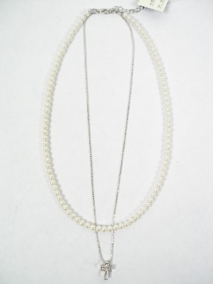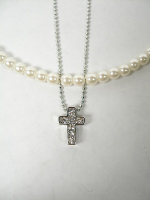 スワロフスキーを使用した小さなクロスのネックレスと人工パールのネックレスが首の後ろでつながっています。(別々にはなりません)