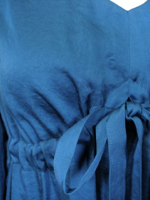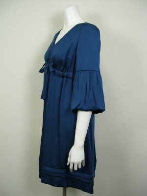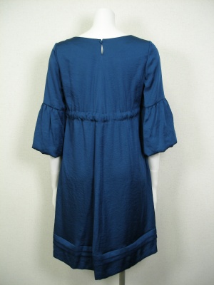 光沢素材のふんわりしたワンピース。アンダーバストのリボンを絞ってギャザーを調節します。裏地なし。