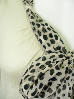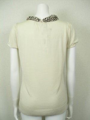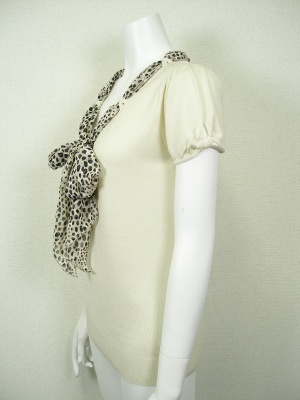 柔らかい素材のVネックニット。ネックラインのループにアニマル柄のスカーフ(ポリエステル)を通してあります。