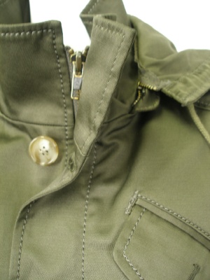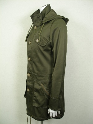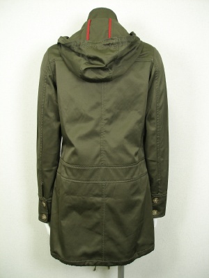 大きすぎずスッキリ着こなせるミリタリーコート。裏側の赤いパイピングが隠れたポイント。ストレッチ素材です。