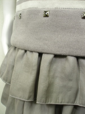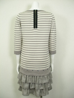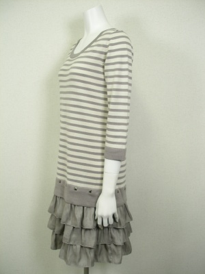 柔らかい素材のボーダーニットにティアードスカートを付けたデザイン。スカートはポリエステルで少し光沢があり、裏地はありませんが一枚でもお召しいただけます。