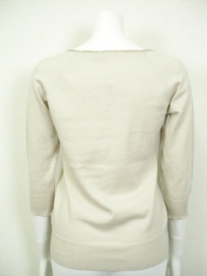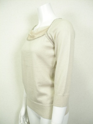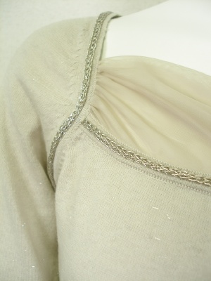 スクエアカットのニット、胸元のシフォン地がオシャレ度をアップ、トリミングにラメ糸を使ってよりシフォンを際立たせる