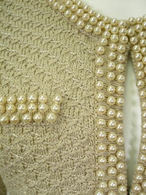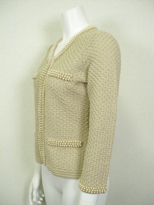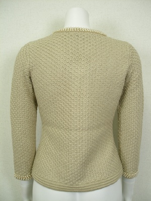 シャネルタイプのニットジャケット、パールのトリミングがとてもニットとは思えない羽織に仕上がっています