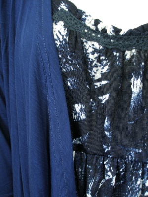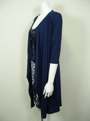 ワンピースの上にカーディガンを重ねたように見えるデザイン。実際は柄の部分は前身ごろのみで、脇でカーディガンとつながっています。フランス製。