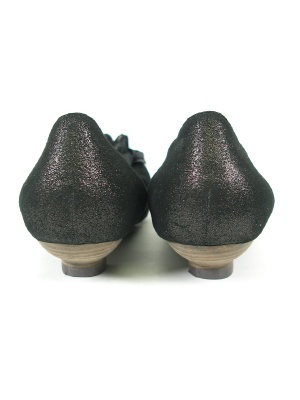 丸いトゥについたコサージュが可愛いパンプス。黒の生地に細かいラメ入り。