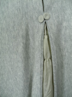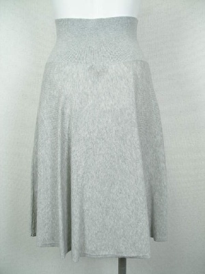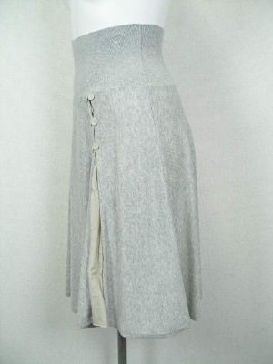 リブのウエストでラクに穿けるニットスカート。前の斜め左側から別素材(コットン・シルク)がチラリとのぞきます。ポリエステルのペチコート付き。