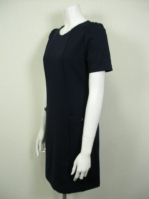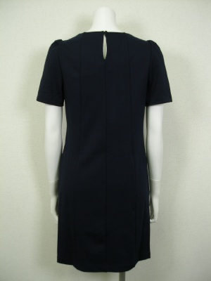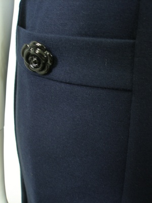 ポケットや首の後ろにバラ型のボタンを使っています。ややタイトなデザインですが、ジャージー素材なのでラクな着心地。裏地なしですが透けません。