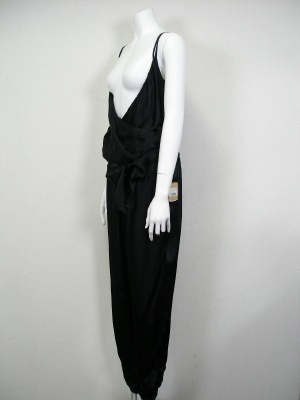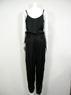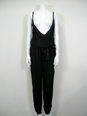 光沢素材のオールインワン。トップはカシュクール風でウエストはゴム、裾はギャザーを寄せています。リボンベルトは取り外せます。