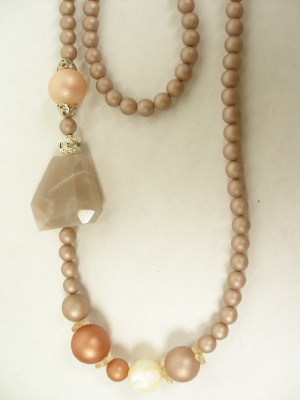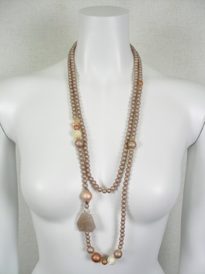 ベージュピンクの樹脂パールと、天然石の2連ネックレス。マザーオブパール、ムーンストーンを使用しています。