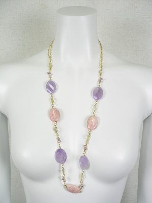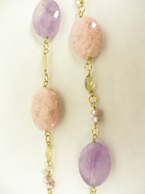 天然石をゴールドのチェーンでつなげたネックレス。アメジスト、インカローズ、シリトンを使用しています。