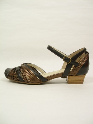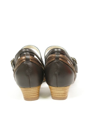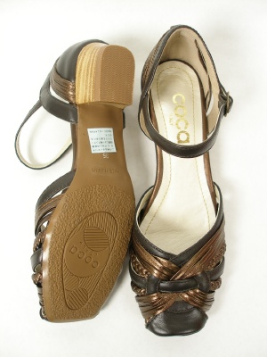 安定したヒールとストラップで、とても履きやすいタイプ。ダークブラウンとブロンズの2色使いです。