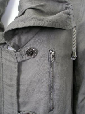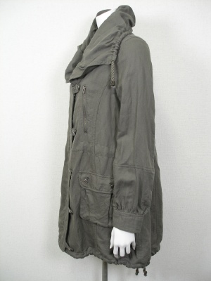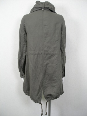 麻混の春用モッズコート。ウエストの内側に通した紐を絞ると、また違った表情に。裏地なし。