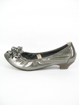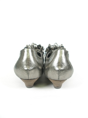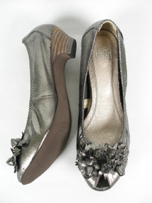 お花のモチーフ付きでオープントゥのパンプス。反ったつま先とキャザーで脚にフィットしやすい。