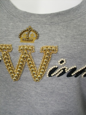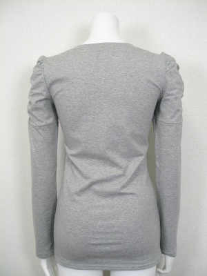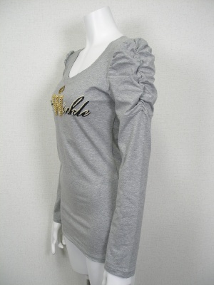 刺繍とビーズのロゴ。袖上部のシャーリングで、さりげなく二の腕をカバーします。