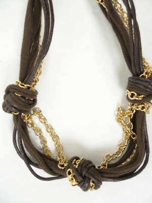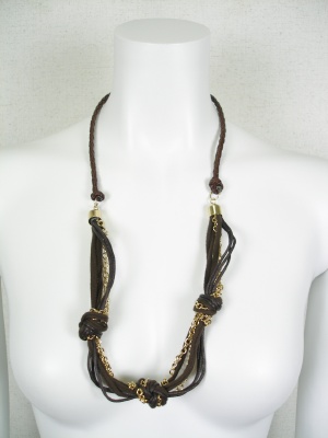 ブラウンの紐とゴールドのチェーンを合わせた存在感のあるネックレス。
