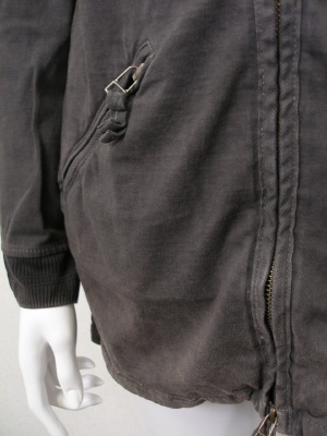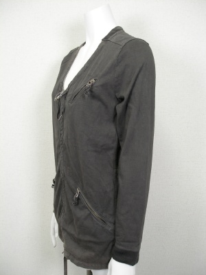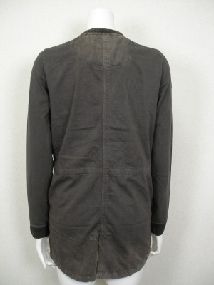 製品洗いで強い色落ち感があります。ネックラインと裾、ウエストの内側に紐を通してあり絞れます。裏地なし。
