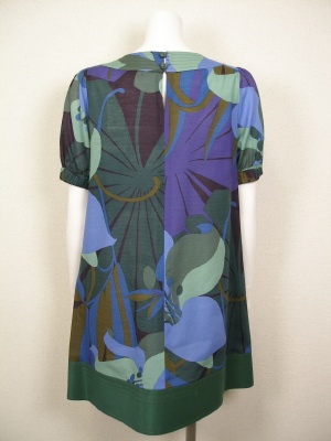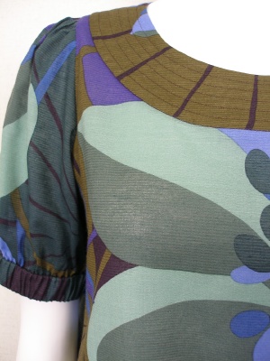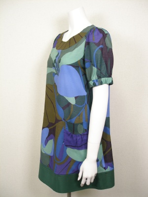 大きな花柄のAラインワンピース。長めのお袖が二の腕もカバーしてくれます。裏地なし。