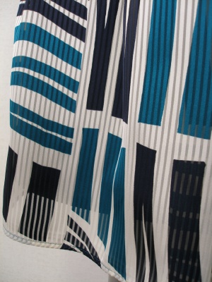 透けるラインと透けないラインの細いストライプの生地に、ネイビーとグリーンの涼しげなプリント。裏地付き。