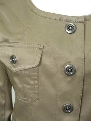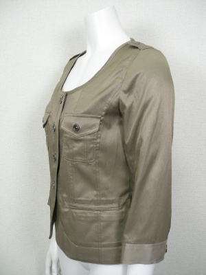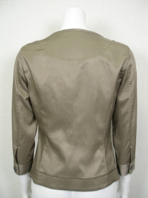 上品な光沢のあるノーカラージャケット。ストレッチの効いた素材なので細身ですが着やすく、スカートにも合わせやすいジャケットです。