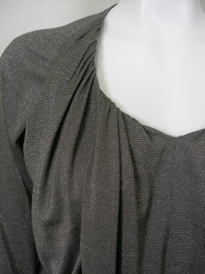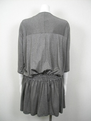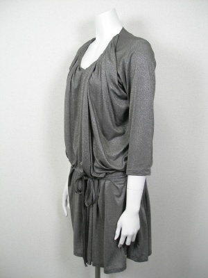 トロンとして柔らかくストレッチの効いた素材なので、キレイにドレープが出ます。サイズの「着丈」はハンガーに吊るした状態の長さで、実際はブラウジングする為短くなります。ラメ糸使用、裏地なし。