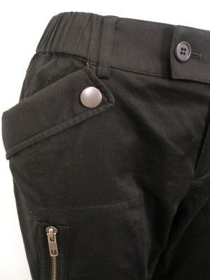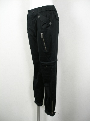 張り出したポケットが特徴のサルエルパンツ。腰から腿にかけてはややゆとりがあり、裾に向かって細くなります。ウエストの両サイドと裾はゴム。ストレッチ素材。
