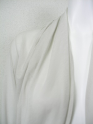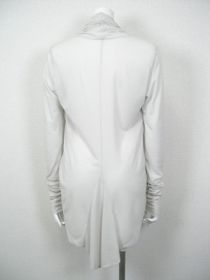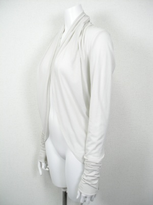 やや透ける薄い素材のドレープカーディガン。前から後ろへ流れるようなラインです。サイズの「着丈」は後ろの一番長い部分を測りました。