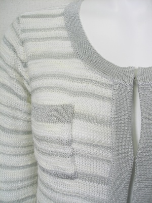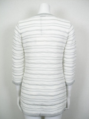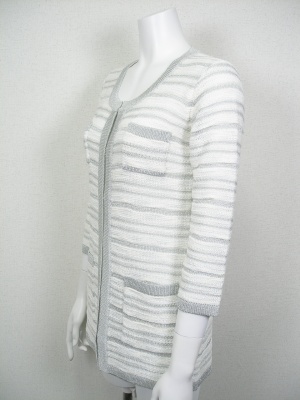 白とシルバーのランダムなボーダー柄。ジャケットのようなきちんと感がありますが、着やすい裏無しのニットです。